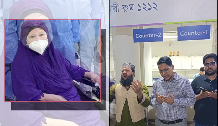 সেখানে তিনি বেগম খালেদা জিয়ার চিকিৎসার খোঁজ খবর নেন এবং রোগমুক্তি ও দীর্ঘায়ু কামনা করে দোয়া করেন।